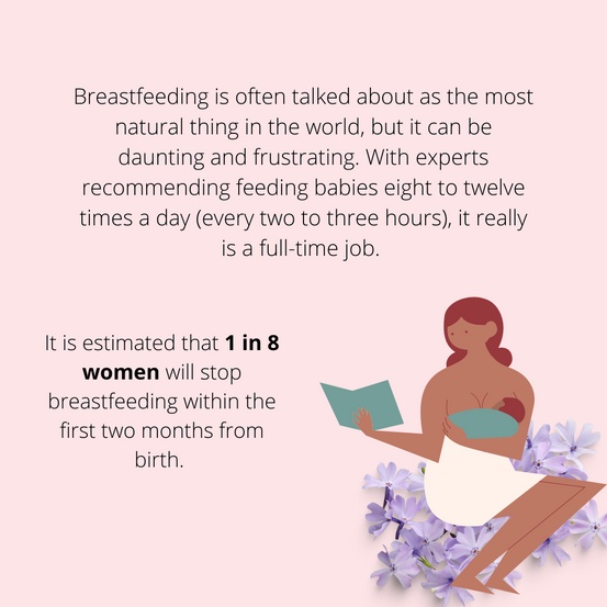 Breast milk is easy to digest and contains all the nutrients that a baby needs in the first 6 months of life, including fats, carbohydrates, proteins, vitamins, minerals and water. It also contains factors that can help the baby’s immune system and the absorption of nutrients. Breastfeeding is often talked about as the most natural thing in the world, but it can be daunting and frustrating. With experts recommending feeding babies eight to twelve times a day (every two to three hours), it really is a full-time job. It is estimated that 1 in 8 women will stop breastfeeding within the first two months from birth. This is often due to a lack of support, fatigue, concerns about supply, having to return to work, other childcare commitments often get in the way of breastfeeding.
